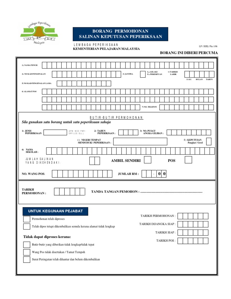 Borang permohonan salinan keputusan peperiksaan spm. Borang Permohonan Salinan Keputusan Lembaga Peperiksaan Kementerian Pelajaran Malaysia Borang Ini Diberi Percuma Borang Permohonan Salinan Keputusan Peperiksaan 1 Nama Penuh 2 Pdf Document. 43 Penilaian Menengah Rendah PMR pada atau selepas 1998 - satu 1 jam. Tanpa berlengah lagi jom tengok bagaimana cara memohon salinan keputusan peperiksaan dengan mudah daripada pihak Lembaga Peperiksaan LP.