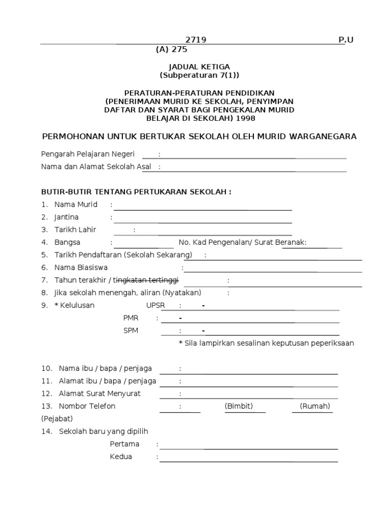 Permohonan Untuk Bertukar Sekolah Oleh Murid Warganegara Borang
