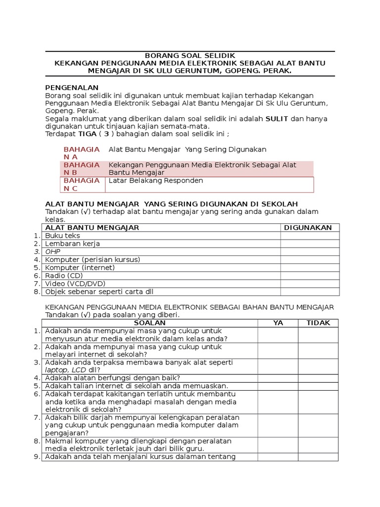 Related Posts To Contoh Borang Soal Selidik Penggunaan Bahan Bantu Mengajar Contoh Borang Soal Selidik Penggunaan Bahan Bantu Mengajar 2018-08-09T091900-0700. Bahan Bantu Mengajar Bahasa Arab sukar didapati di pasaran. Kajian berbentuk tinjauan dengan menggunakan soal selidik sebagai alat kajian dan analisis dokumen.
