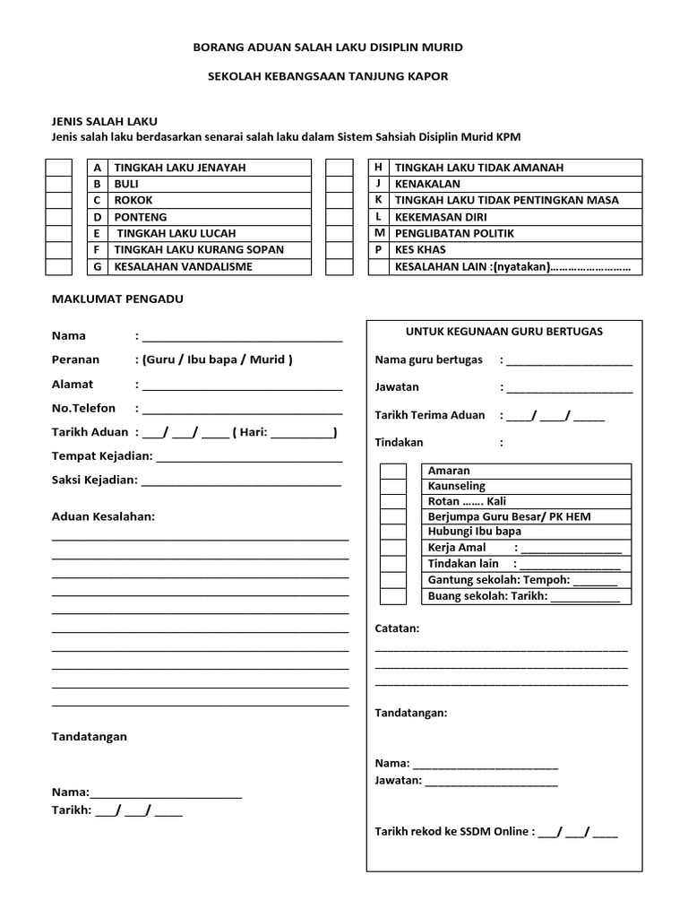 Borang Aduan Salah Laku Disiplin Murid. Sekolah-sekolah Murid Orang Asli yang mana peratus kehadiran sangat rendah perlukan kesungguhan ibu bapa tok batin dan agensi-agensi strategik seperti Jabatan Kemajuan Orang Asli Jakoa bagi membantu. Borang Salah Laku Disiplin Murid.